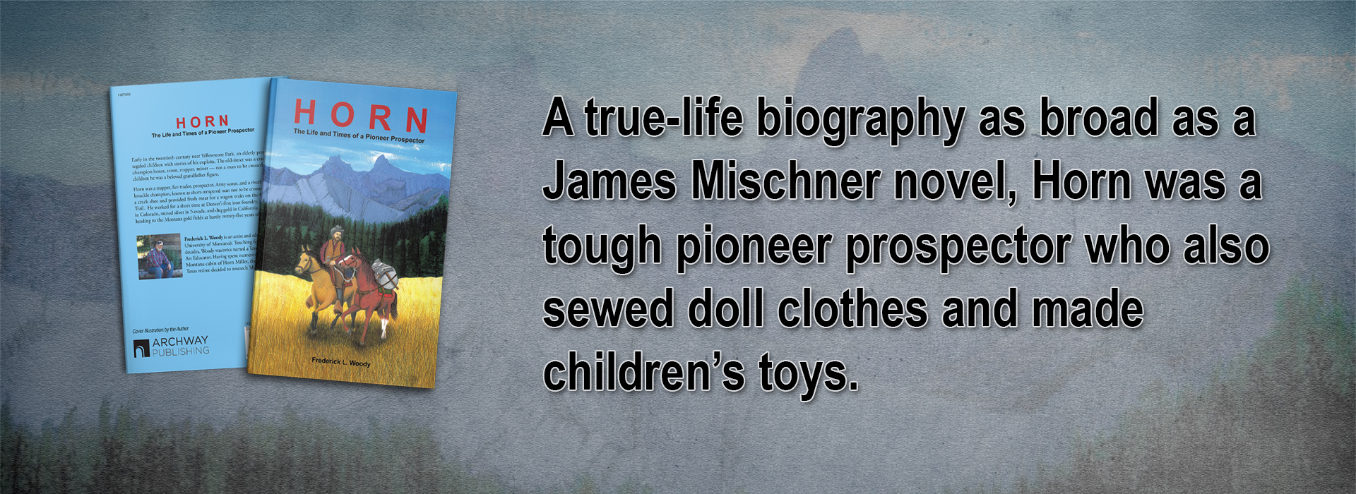 This is the story of Adam “Horn” Miller and the times in which he lived (1837-1917). It is the story of a tough Montana pioneer whose giant calloused hands made toys for a little boy and sewed clothes for a young girl’s favorite store-bought doll.